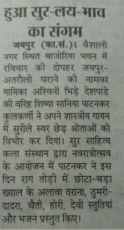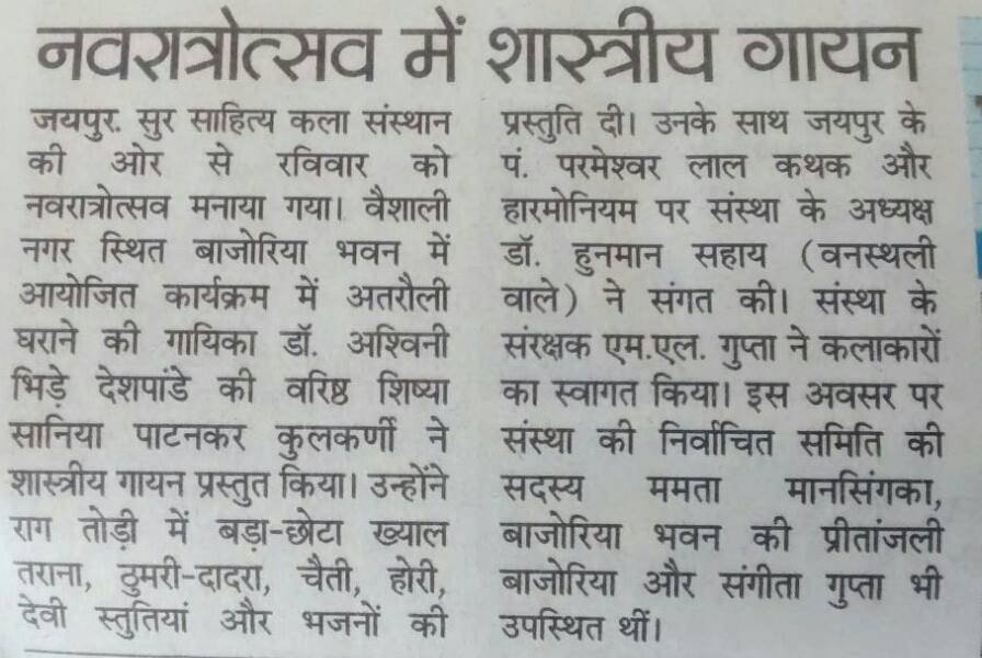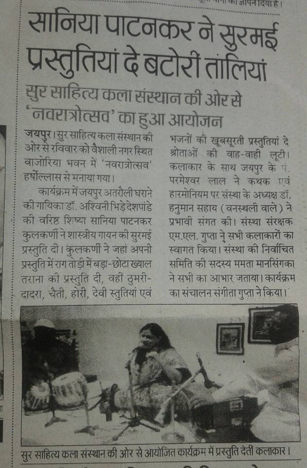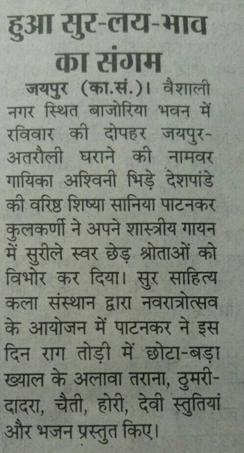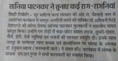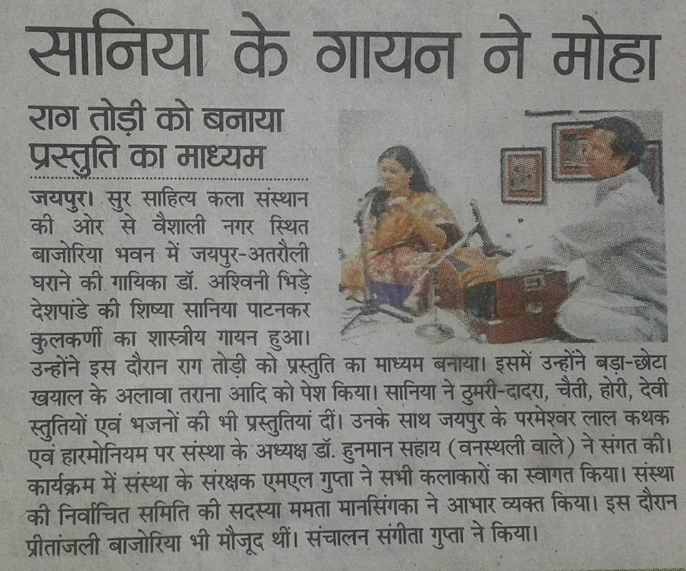 सुर साहित्य कला संस्थान की ओर से आयोजित संगीत के कार्यक्रम में इस बार जयपुर अतरौली घराने की वरिष्ठ गायिका विदुषी अश्विनी भिड़े देशपांडे जी की वरिष्ठ शिष्या श्रीमती सानिया पाटनकर जी का एकल कंठ गायन रखा गया है।
