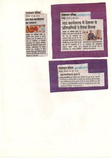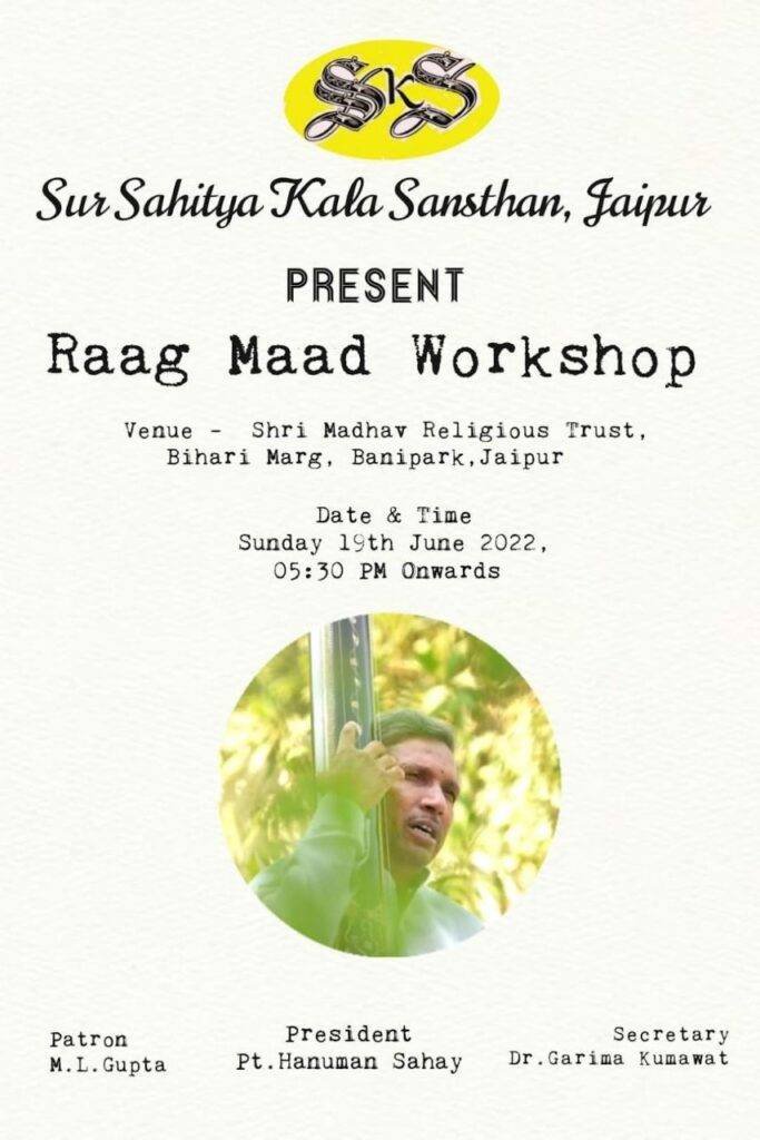 सुर साहित्य कला संस्थान की ओर से *राग माड* की कार्यशाला का आयोजन किया जा रहा है। यह कार्यशाला बनिपार्क स्थित माधव रिलीजियस ट्रस्ट के सहयोग से की जा रही है। कार्यशाला 10 वर्ष से अधिक आयु के प्रशिक्षणार्थियों के लिए है। सोमवार 6 जुन 2022 से 20 जुन 2022 तक प्रातः 8 बजे से माधव रिलीजियस ट्रस्ट, बिहारी मार्ग बनिपार्क के प्राकर्तिक वातावरण में होने वाली इस कार्यशाला का उदेश्य *राजस्थान के विशिष्ट गायन शैली राग माड* के स्वरूप को व राजस्थान की सांस्कृतिक परंपराओं को जन-जन तक ले जाने का एक प्रयास है। इस कार्यशाला को ओनलाईन भी किया गया है, जिसमे हैदराबाद,आगरा,चेन्नई, दिल्ली के अनेक प्रशिक्षु शामिल हो रहे हैं।  राजस्थान के वरिष्ठ गायक पंडित हनुमान सहाय प्रशिक्षण दे रहे हैं। प्रशिक्षण के दौरान गायन के साथ-साथ, माड के सभी पहलुओं पर विस्तृत रूप से प्रशिक्षणार्थियों को बताया जाएगा व समय-समय पर कतिपय माड के विशेषज्ञों द्वारा व्याख्यान भी करवाया जाएगा, ताकि वर्तमान समय में माड के स्वरूप को संशयात्मक दृष्टि से समझे जाने वाले वर्ग को माड के विषय में जानकारी भी हो सके। कृपया सही शब्द का इस्तेमाल करें राग माड (मांड एक गलत व अपभ्रंश भाषा साहित्य का शब्द है जिसका अर्थ बदल जाता है) आप सभी के सहयोग से इसे सही किया जाना चाहिये।