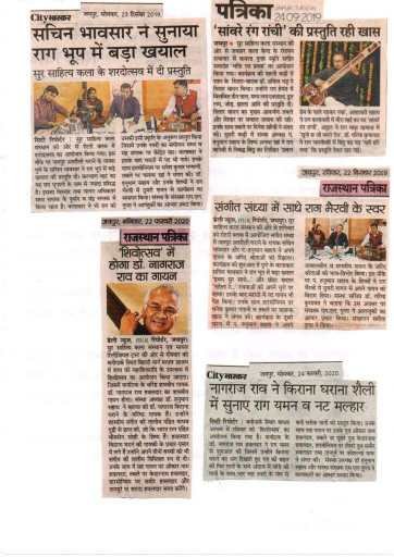 सुर साहित्य कला संस्थान एवं माधव रिलीजियस ट्रस्ट की ओर से 23 फरवरी 2020 बिहारी मार्ग बनीपार्क जयपुर स्थित माधव आश्रम में सांय 6:30 से 9:30 बजे तक महाशिवरात्रि के उपलक्ष में “शिवोत्सव” का आयोजन किया गया। कार्यक्रम में कर्नाटक के डॉ. नागराज राव हवलदार ने शास्त्रीय संगीत की प्रस्तुति दी डॉ. नागराज किराना घराने के गायक हैं। आपने शास्त्रीय संगीत की तालीम पंडित माधव गुड़ी से प्राप्त की जो कि भारत रत्न पंडित भीमसेन जोशी जी के शिष्य हैं। कार्यक्रम में डॉ नागराज ने राग यमन से कार्यक्रम की शुरुआत की, आपने किराने घराने के अंग को गायकी में दिखाते हुए राग की बढ़त करते हुए राग के आलाप तानो का क्लिष्ट अंदाज दिखाया।इसके पश्चात अपने राग नट मल्हार मे किराना घराने की पारम्परिक बन्दिश सुनाकर श्रोताओं की दात पाई, राग भाटिया में कन्नड भाषा मे देवी स्तुति की प्रस्तुति से श्रोताओं को भव विभोर कर दिया, कार्यक्रम के अन्त मे राग भैरवी मे ब्रम्हानंद जी का भजन जो भजे हरी को सदा प्रस्तुत कर संस्था को शुभकामनायें दीं। आप अपने पूरे परिवार के साथ कार्यक्रम में प्रस्तुत हुये। आपके साथ सह गायन पर आपके पुत्र श्री ओंकार नाथ हवलदार, तबले पर आपके पुत्र श्री केदारनाथ हवलदार, हारमोनियम पर आपके पुत्र श्री समीर हवलदार व तानपुरे पर शारदा हवलदार एवं कोशल्या मारू ने संगत की। संस्था अध्यक्ष डॉ हनुमान सहाय जी ने कहा की संस्था साधक कलाकारों को आमंत्रित कर गौरवान्वित महसूस करती है, अतः शास्त्रीय संगीत के प्रचार प्रसार हेतु ऐसे कलाकारों का जयपुर में आना सौभाग्य की बात है अतः कार्यक्रम में संगीत के विद्यार्थियों को भी ऐसे कलाकारों का लाभ उठाना चाहिए। संस्था संरक्षक श्री एम एल गुप्ता ने कलाकारों का सम्मान व आभार व्यक्त किया। कार्यक्रम में शहर के दिग्गज कलाकार मौजुद थे। जिनमे पं महेश दत्त शर्मा, श्री अनन्त व्यास, श्री पंकज कट्टा, श्री राजेन्द्र परनामी , प्रो अमला बत्रा, श्री इक़बाल खाँ, श्री मुकेश मथुर, डॉ सुनील राही आदि। कार्यक्रम का संचालन श्रीमती संगीता गुप्ता जी ने किया।