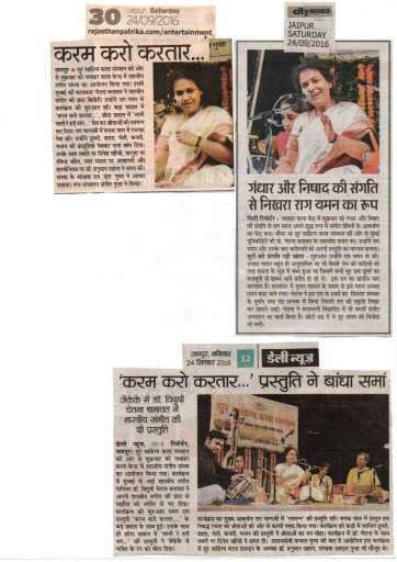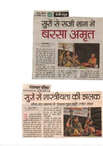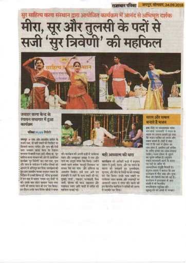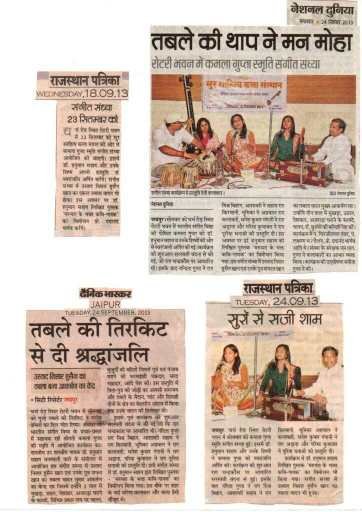 सुर साहित्य कला संस्थान  की ओर से प्रत्येक वर्ष की भांति इस वर्ष भी श्रीमती कमला गुप्ता स्मृति संगीत समारोह का आयोजन किया गया। संस्था सचिव डॉक्टर गरिमा कुमावत ने बताया कि यह कार्यक्रम संस्था के संरक्षक श्री एम एल गुप्ता द्वारा श्रीमती कमला गुप्ता जी के जन्मदिवस  के उपलक्ष में वर्ष 2013 से कराया जाता आ रहा है । सोमवार दिनांक 23 सितंबर 2019  को  शाम 6:00 बजे  जवाहर कला केंद्र जेएलएन मार्ग जयपुर के  रंगायन सभागार में शास्त्रीय संगीत  में “भक्ति रस प्रवाह” कार्यक्रम सम्पन्न हुआ ।
